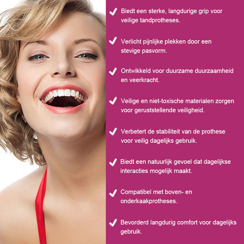 ✔ Zorgt voor een veilige pasvorm, verbetert de stabiliteit van de gebitsprothese.